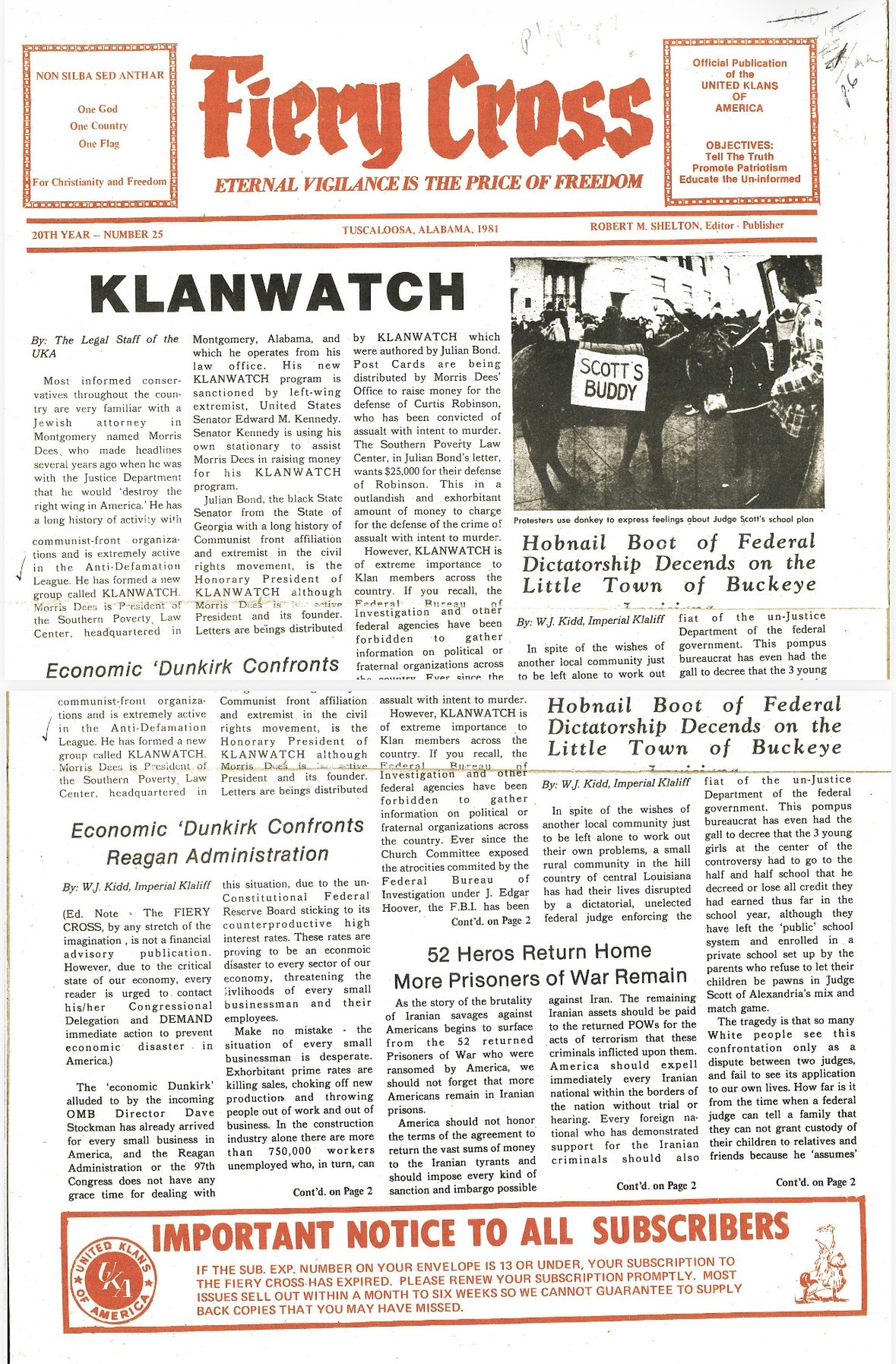 In 1981, the paper ran the front-page headline: KLANWATCH, “to warn Klanspeople and our supporters about the purpose of KLANWATCH and the dangers it involves.”